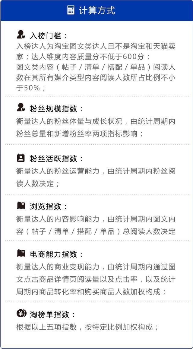 本期潮男着装日志,以超强的电商能力(电商能力指数187)稳居TOP1。TOP2极客宅,TOP3数码零极限,以“团队”作战方式 ,在浏览指数方面(分别为188分,193分)表现突出,有望后期冲击榜首。极客宅和数码零极限同属河豚联盟,该联盟是由淘宝数码领域达人,发起并组建的电商自媒体联盟,专注数码家电垂直领域,聚合横跨多个平台的原创自媒体。孤木难成林,通过强强联合,帐号矩阵覆盖更多渠道,有效为淘宝商家输出优质原创内容,产生较好引流效果。 本期入榜达人,有6位来自2017年3月淘宝发起的千人大咖登淘计划,整个登淘计划可以用“4快”来概括,快速入驻认证、快速获取流量、快速增粉方式和快速商业化扶持。通过一年多的发展,不难发现这些达人在内容生态红利期完成了原始积累,在后续的爆发中储备了强劲的动力。今年年初淘宝内容生态总监闻仲提出内容生态超级合伙人计划,不知又将有多少达人、机构能够登上这艘快船,在内容生态中乘风破浪。 另据统计,本期榜单有9位达人为认证自媒体达人,涵盖数码科技,汽车以及时尚领域。例如本次入榜的TOP6谈车工坊,成立于2014年12月,专注于汽车资讯的深度挖掘与传播,擅长产品解读、深度试驾、对比导购、行业分析等类型文章的撰写。内容覆盖多个平台,目前微淘粉丝12.1万,曾入选新浪汽车自媒体前五、今日头条汽车自媒体前六。除了稿费、广告,内容流量收益、知识付费等变现方式外,越来越多的自媒体人倾心淘宝平台创作内容的趋势也愈发明显。 用手机淘宝扫描榜单达人后方微淘二维码,了解更多达人内容信息。 数据来源:阿里官方数据,算法参考如下:
