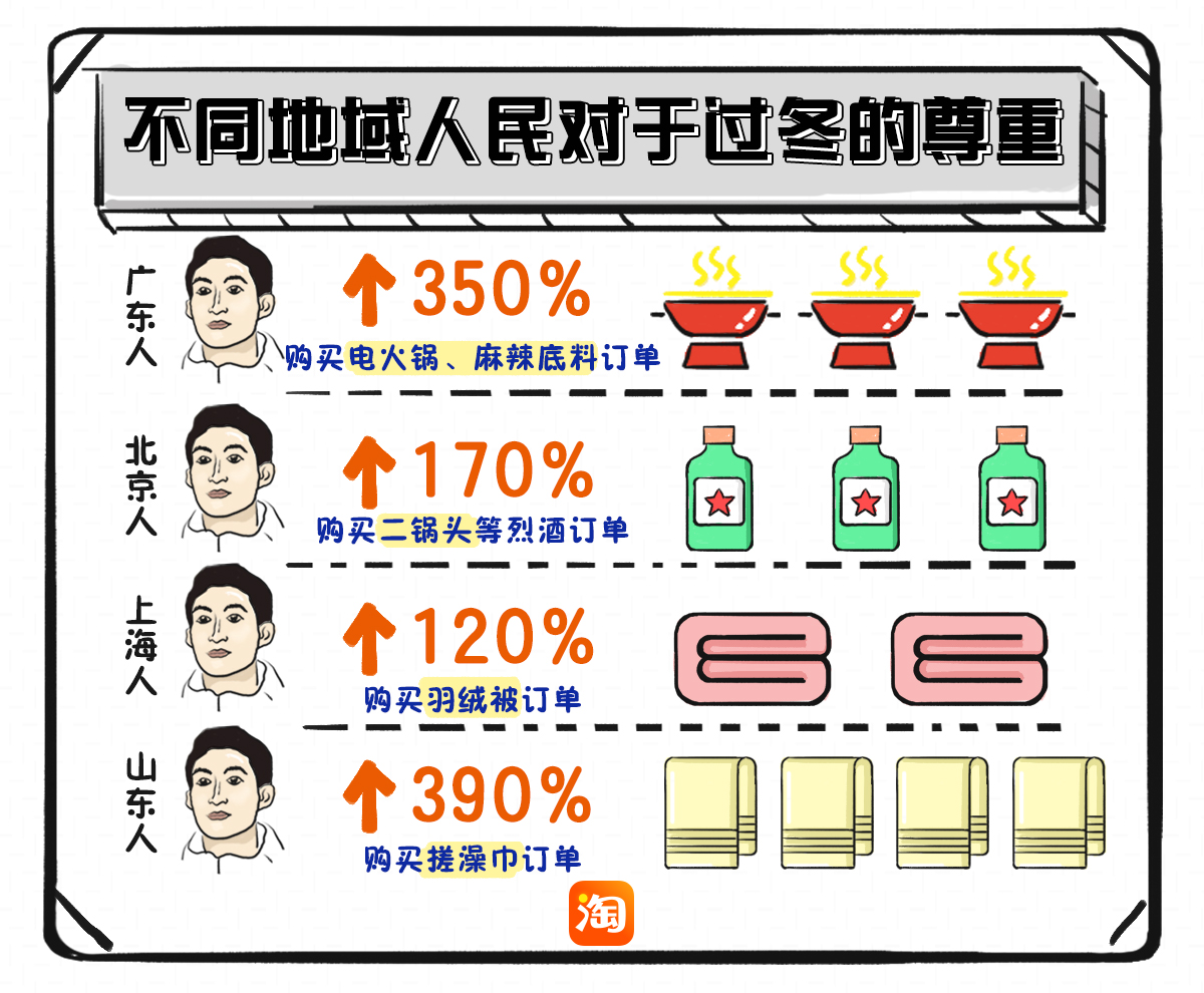 除了物理解决避冬难题,南北方人在饮食上的分歧也显示了南北差异。数据显示,北方人在冬天更多采购二锅头等烈酒来过冬;而南方人则偏爱购买冲泡奶茶、电火锅来“化学攻击”寒冷。具体到不同城市来看,今年冬天,北京人购买二锅头等烈酒订单较上一年增长170%,而广东人对于“冬天”的尊重是购买更多电火锅和麻辣底料,相关订单同步上涨350%。最有意思的要数山东人了,他们既不关心喝,也不关心吃,但非常注重冬季清洁,搓澡巾成交量同比飙升390%。