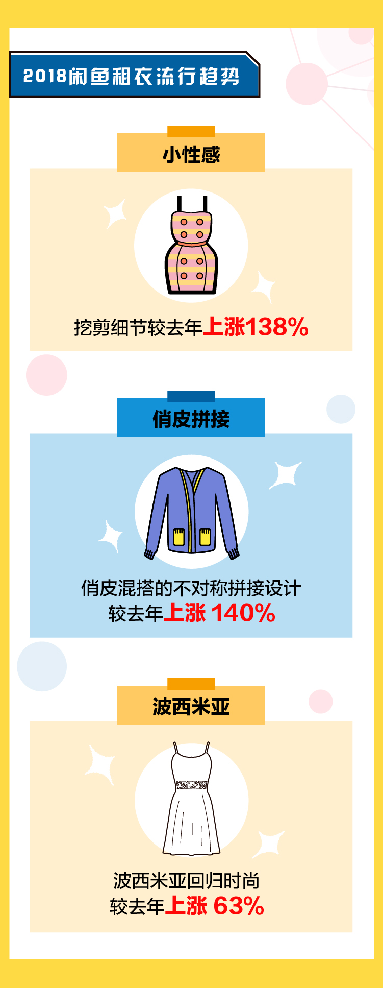 闲鱼租衣服2018三大流行趋势:性感、俏皮拼接和波西米亚风 95后女孩汪雨已经习惯了在闲鱼一周租一次衣服的生活了,她说:“潮流变化太快,每天想要尝试的风格不一样,但是如果全部衣服都要买下来,和我们这种初入职场的薪资水平完全不符,而且每件衣服只穿几次,特别浪费,这是我选择租衣服的原因。”这些“精致的租租女孩”往往对时尚趋势颇为敏感,于是租衣一族的时尚偏好往往反映着一年的潮流。2018年,闲鱼租衣潮流的三大趋势分别是小性感、俏皮拼接和波西米亚风。别出心裁地在肩膀、腰部等小面积镂空设计的衣服,被租次数较去年上涨了138%。使用混合面料拼接,凸显俏皮混搭的不对称拼接设计较去年上涨140%,并从春夏延续到秋冬。此外,波西米亚回归时尚,较2017年上涨63%。