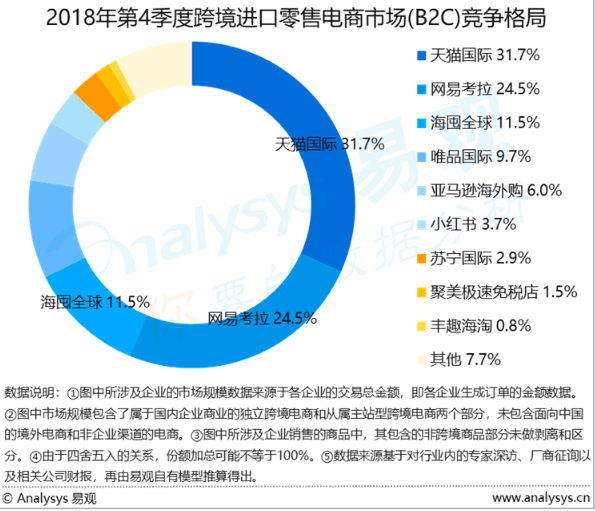 杭州淘宝代运营|易观:2018Q4跨境规模环比增36% 天猫国际扩大领先时间:2019-01-23 1月23日,Analysys易观发布《中国跨境进口零售电商市场季度监测报告2018年第4季度》。数据显示,2018年第4季度,中国跨境进口零售电商市场规模为1145.6亿元,环比上涨36.0%。 第4季度,天猫国际保持了快速增长,不仅以31.7%的份额继续保持第一,相比Q3的30.2%,天猫国际Q4增长了1.5个百分点,并进一步扩大领先优势。