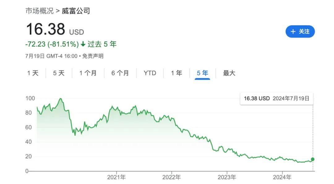 据财报数据,2023-2024财年,威富集团营收104.6亿美元,连续第二财年呈下滑趋势,同比降低9.98%,集团亏损约9.7亿美元(约合人民币70.5亿元),这是自2019财年以来威富集团首次出现亏损,其股价相比2021年的巅峰时期,缩水近80%。