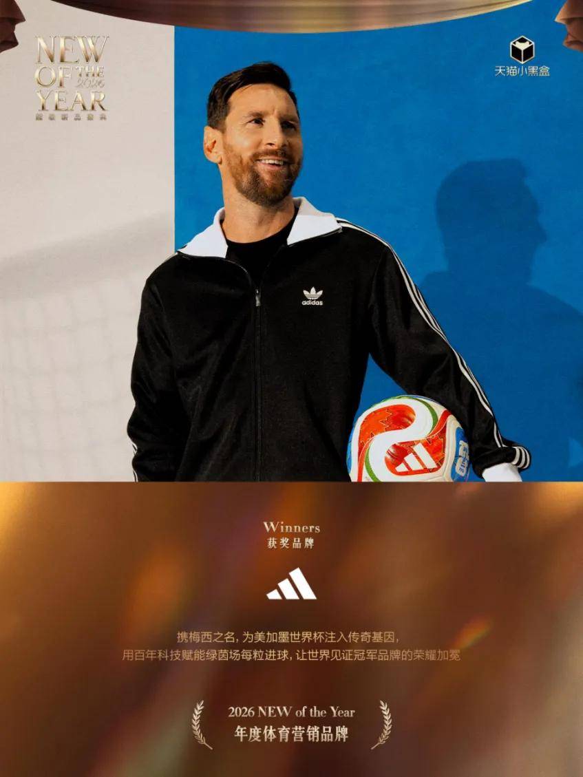 荣获“年度体育营销品牌”的阿迪达斯,2025年携手梅西为美加墨世界杯注入传奇基因,面向全球讲述冠军品牌荣耀加冕的故事,在“天猫超级品牌日”的助推下,其年度新品adizero Evo SL竞速马拉松跑鞋登顶运动户外行业TOP1、全域曝光12亿,为体育营销做出范式创新。